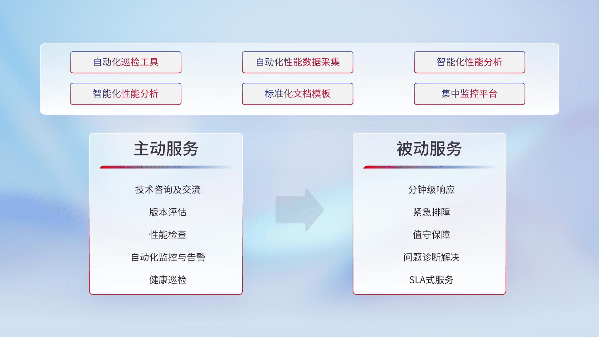 智能化工具和标准化文档,,,,保障服务质量,,,提供主动服务(包含技术咨询、、版本评估、、、性能检查、、自动化监控与告警、、、、健康巡检)和被动服务包含(分钟级响应、、、、紧急排障、、、、值守保障、、、、问题诊断解决、、、、SLA服务)。。。